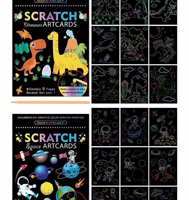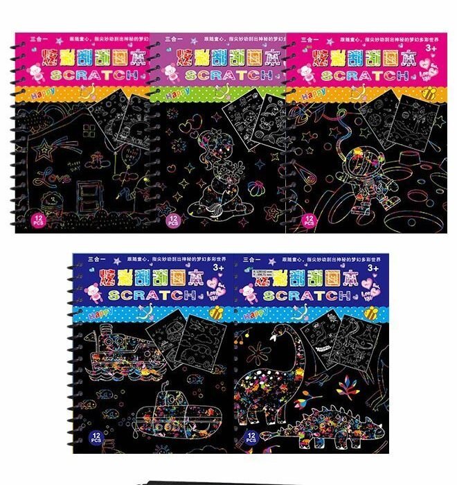GROIC 5 Pack Scratch Arts Drawing Notebook Paper for Kids Art Supplies, Scratch Paper Art Books Creative Coloring Drawing Toys Kit, Dinosaur + Transportation + Universe + Mermaid + Monster