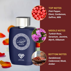 Experience the allure of elegance and enchantment with AQUA DE PARFUM AWATIF 100ML. Indulge your senses as this fragrant masterpiece captivates with invigorating citrus top notes, delicate white florals in the heart, and a warm base of rich amber and velvety vanilla. Designed for both men and women, it transcends gender boundaries with its balanced composition. This long-lasting luxury fragrance will keep you enveloped in its enchanting aura all day long. Perfect as a gift or to treat yourself, let AQUA DE PARFUM AWATIF become your signature scent that adds sophistication to every moment. Elevate your senses today – step into an enchanting world of elegance like never before!