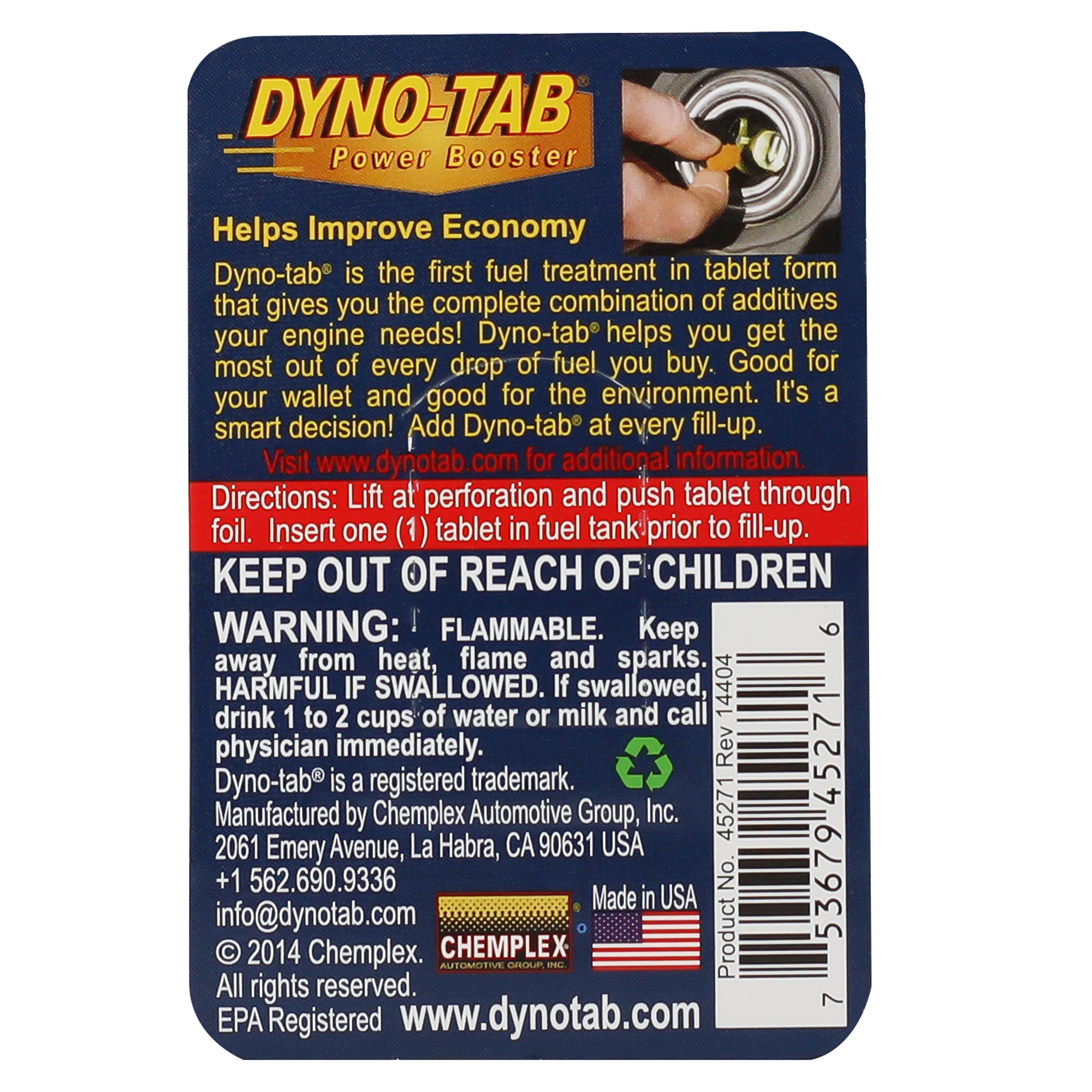 Dyno-tab® Fuel Treatment is a safe, fast dissolving fuel additive in tablet form that is made from 100% active ingredients. Dyno-tab® eliminates the fluid carrier component of most fuel additives and dramatically reduces transportation costs, storage requirements and packaging waste. In this regard, Dyno-tab® is better for the environment.