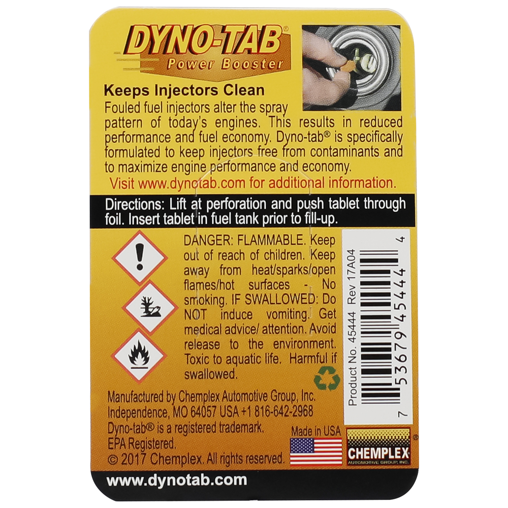 Dyno-tab® PLUS is a multifunctional fuel additive that combines the benefits of Dyno-tab® Fuel Treatment with a powerful detergent/dispersant that fights the harmful effects of fouled fuel injectors and a fuel stabilizer that retards the formation of gum, varnish and sludge.