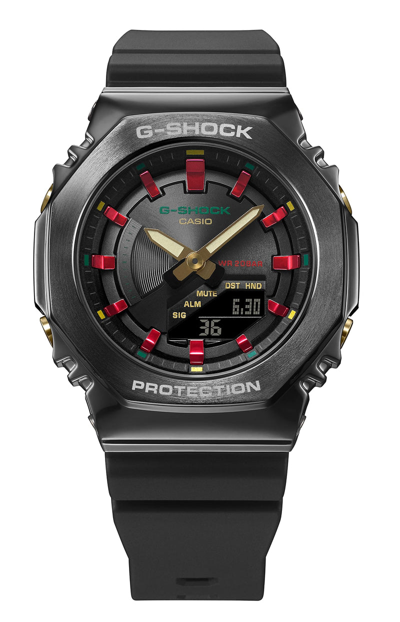 This festive pair of watches features a uniquely decorative take on the base model ? the popular slim & simple GA-2100 ? one standard size and the other a more petite version. Ornamental touches of gold, green, and red accent chic black, recalling the twinkling holiday lights that light up the winter skies. These beautiful paired timepieces are sure to make the season extra-special.