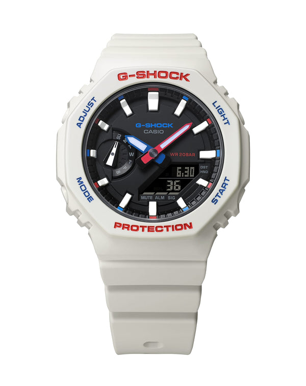 Celebrate a wintery wonderland with the iconic octagonal G-SHOCK, now in a stand-out tricolor design. Touches of red and blue on the bezel, indexes, and watch hands accent the neutral black and white color scheme, ready for everything from urban to winter resort fashion. The classic G-SHOCK look in a smaller, thinner profile will suit your style, no matter the occasion.