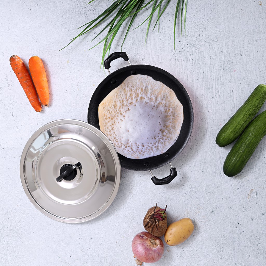 A soft, centre surrounded by beautiful crispy sides is the perfect appam! Dunked in deliciously spicy curries or smooth and coconut stew, this south Indian dish is a staple diet of all those hailing from Kerala. Who doesn’t fantasize about these delectable combinations? Well, now you don’t have to rely on the nearest south Indian restaurant to provide you with your daily dose of appam goodness. The Royalford Non-Stick Appam Pan with lid is the perfect little piece of equipment that is should be next on your kitchen list! With a wide width of 23 cm, this non-stick coated pan comes with a lid and is dishwasher safe. What’s more, you can also use it on all types of cooktops! Grab this pan at steal rates and enjoy scrumptious appams at the comfort of your home. GREAT QUALITY AND NON-STICK SOLUTION – The Royalford Non-Stick Appam Pan (23 cm) is made of high-quality materials that are strong, durable, and long-lasting. Coated with a food-grade coating, it is non-stick and ensures non-sticky appams that are the best combination of soft and crispy! Now you can enjoy appams in the comfort of your own kitchen and what better, with minimal oil. The non-stick coating ensures that the once cooked, appam batter does not stick to the surface of the pan and the delicious, pillowy appams slide right off with minimal effort. Invest in the Royalford Non-Stick Appam Pan and enjoy homemade appams for a long time, with their durable and long-lasting design. COMPACT STEEL LID AND HANDLES ON THE SIDE – The steel lid provided with the Royalford Non-Stick Appam Pan ensures that steam is trapped inside of the appam pan, and this, in turn, ensures that the appams are cooked evenly and air bubbles are formed on the surface. This stainless steel lid can be used easily with a handle on top that does not get hot with heat. The same material is used to craft the two handles on the sides of the pan. These handles also do not heat and are used to rotate the pan once the batter is poured, swirl it and ensure that the batter is evenly distributed in the pan. EASY TO MAINTAIN & SUITABLE – The Royalford Non-Stick Appam Pan is safe to be used on all cooktops such as gas, electric, modular, etc. except for induction stoves. So you can enjoy your food in style without having to worry about hand washing the pans once you are done cooking up a storm in the kitchen! What more does one need? The perfect combination of convenience, tradition, and quality! Dimensions: 24 x 5 x 24 cm ‘
