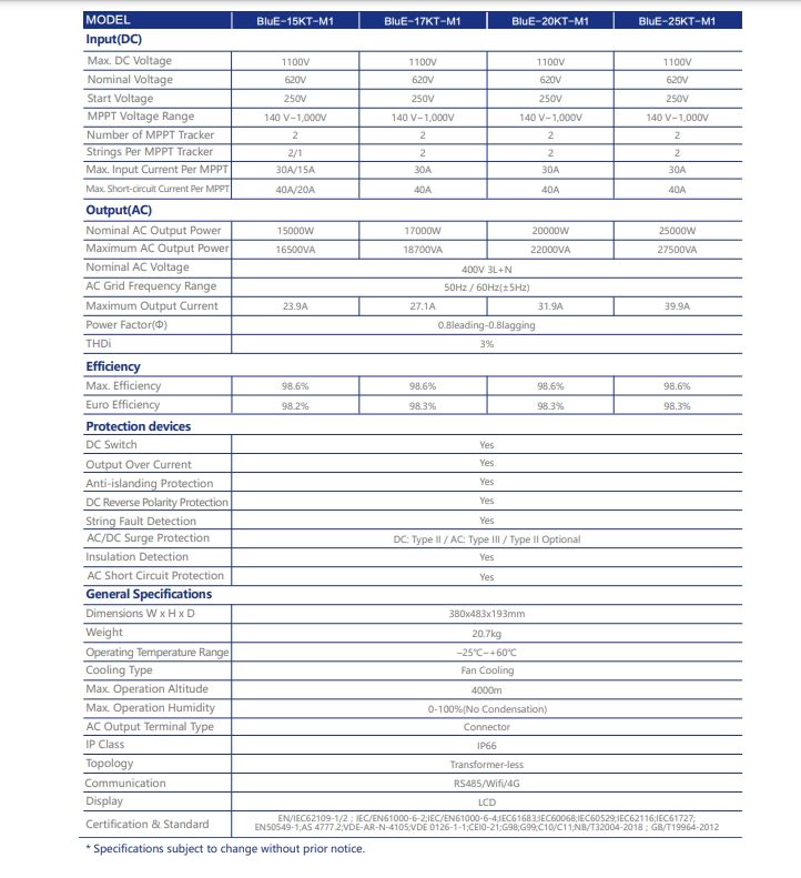 String Grid-Tied PV Inverter BluE-15KT-M1/BluE-17KT-M1/ BluE-20KT-M1 / BluE-25KT-M1 is the up-to-date smart inverter solution which is intelligent and elegant for residential PV systems. It is simple and easy to use, with high-efficiency power generation, high reliability, and much stronger adaptability. Being compatible with large capacity PV panels, these inverters can provide greater options for your household system.
