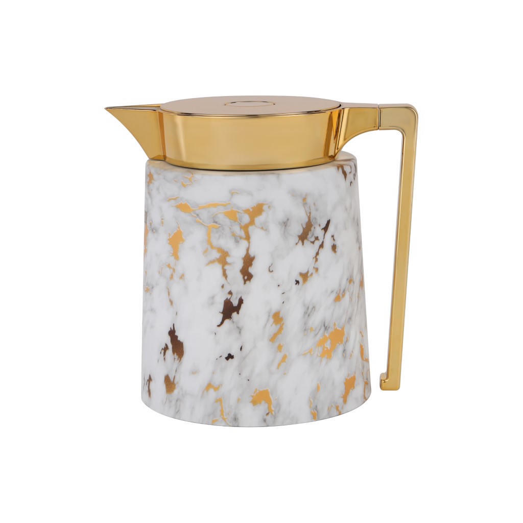 Transform your high tea into an elegant and classy affair. The Royalford vacuum flask from the Marbo collection, with a sturdy and durable pink glass inner pot and a high-quality ABS outer body with a handle, makes it convenient for enjoying your favorite beverage anywhere. The 1000-ml flask is constructed from superior-quality materials and is 100% food-grade, asbestos-free, non-toxic, corrosion-resistant, and safe to use. It also prevents chemicals from leaching into its contents. The flask is uniquely designed to provide you with a healthy way to keep your drinks hot or cold for longer. Fill it with your favorite iced lemonade, hot coffee, or refreshing kahwa, and relax with your family or friends. It also holds onto heat or cold, keeping your beverage at just the right temperature for a wonderful drinking experience. It is attractive and sturdy for storing water or other beverages such as tea, coffee, kahwa, juice, smoothies, milkshakes, etc. It is convenient to use at home while traveling, hiking, road-tripping, visiting hospitals, camping, etc. The vacuum flask has a durable and leak-proof lid and allows you to enjoy your drink without worrying about spillage, cracking, denting, or leaking. It is also mess-free. The lid seals strongly to preserve flavors and freshness. The pouring spout allows you to control the liquid while serving. The ergonomically designed handle provides a comfortable and firm grip. It is strong enough to withstand the contents’ weight while pouring. The wide mouth makes it easy to fill and clean. Its enticing white and golden color palette with marble design makes it an attractive option for your needs. It is smart, stylish, and the right companion for your everyday life since it is crafted with food-grade materials. It is also a thoughtful choice for gifting to your loved ones. “