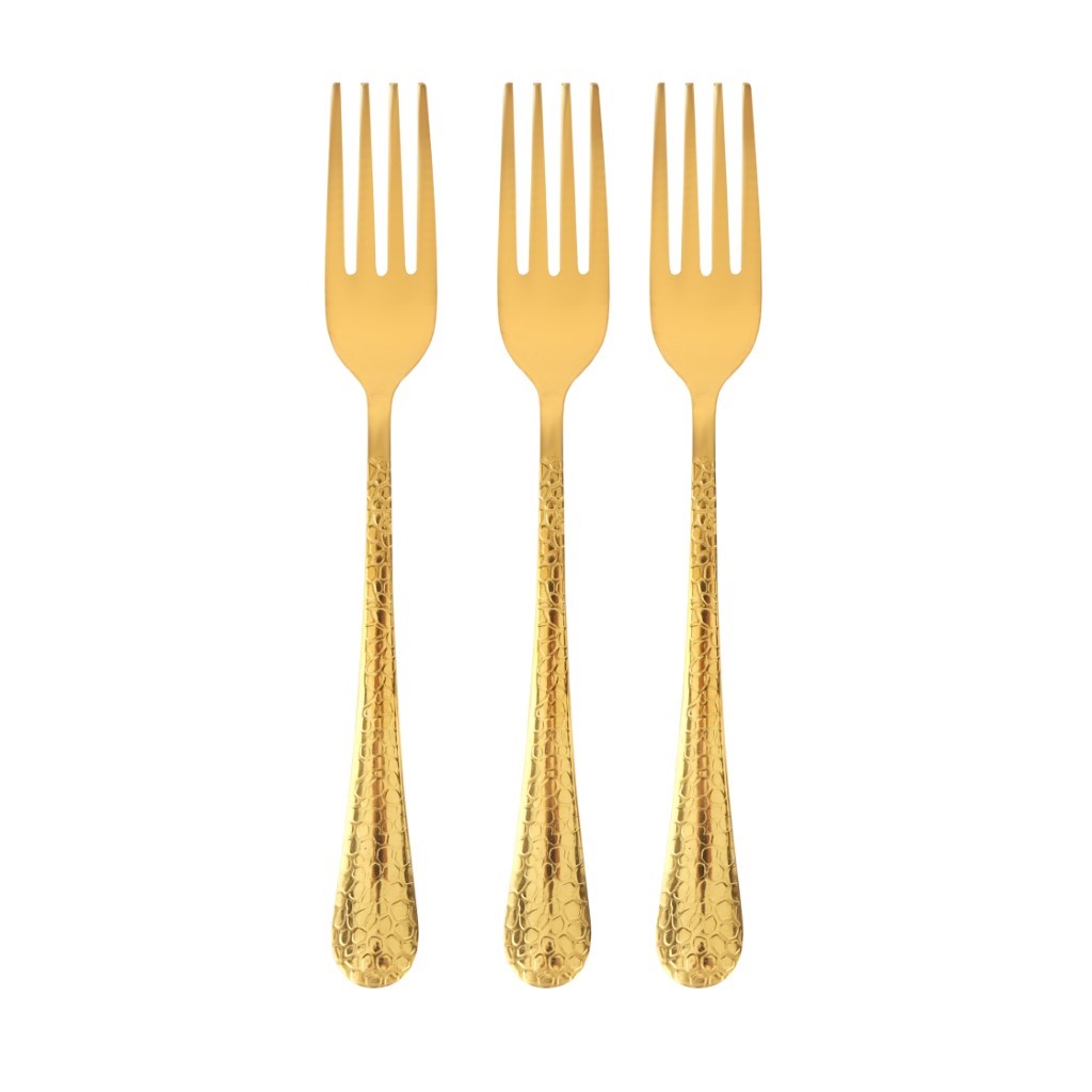 Royalford 18 CM Stainless Steel Dessert Fork- RF11992| 3 Piece Set, Stylish Golden Design with Hammer-Finish Handle, Light-Weight and 100% Food-Grade| Suitable for Dining Table, Home and Restaurant| Dishwasher-Safe and Chip-Resistant| Golden