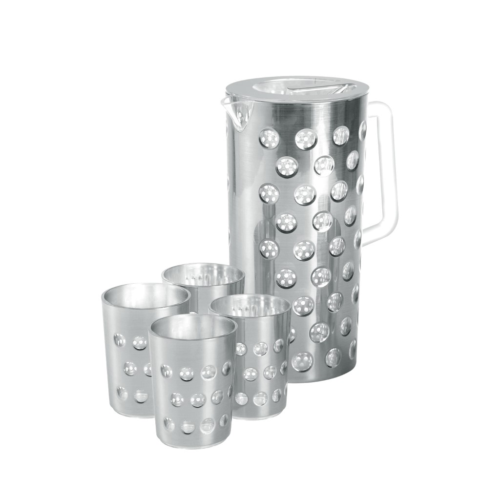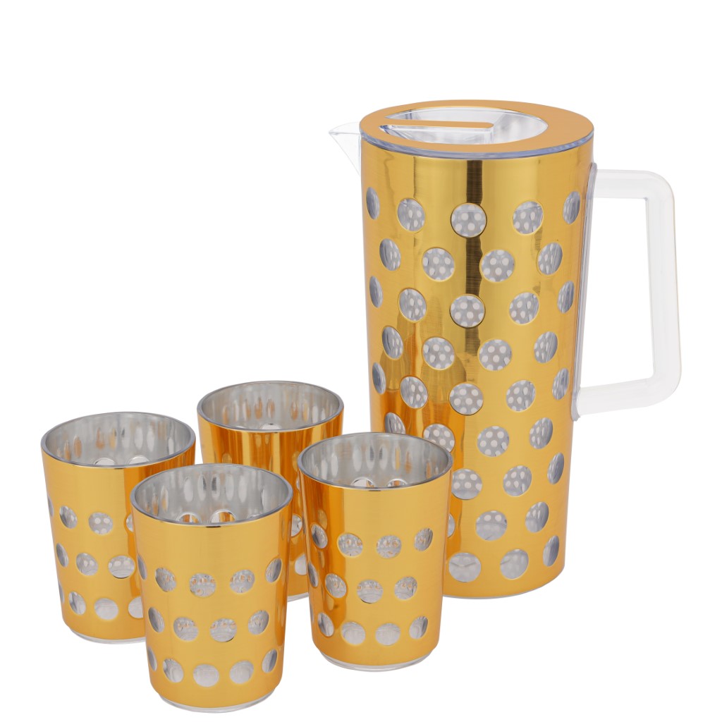 “ Your favorite drinkware is here! You’re sure to impress your guests with this elegant 5-piece juice set from Royalford. Made of strong and durable polystyrene, the jug and glass set are suitable for any occasion. It can be used at home and in restaurants. These are appropriate for get-togethers, dinner parties, casual gatherings, etc. The set includes a jug and four glasses constructed of high-quality and extra-thick plastic and is BPA-free, lead-free, 100% food-safe, non-toxic, hygienic, and safe to use. The set is known for its durability and elegance. Designed to provide a stylish and healthy way to drink, the water jug and glasses are strong and durable. It is attractive and sturdy at the same time. It is suitable for serving hot and cold beverages such as water, juices, milk, mocktails, cocktails, or other drinks. The stylish set in a premium color combination will make a stylish addition to your crockery collection. The jug has a capacity of 2.5 L, while the glasses have a capacity of 400 ml each. These are convenient to use daily and when you have guests at home. It is hassle-free and allows you to enjoy your drink without worrying about spillage. The wide mouth of the jug makes refilling, pouring, and cleaning easy. The set can be washed and reused. The jug has an ergonomic grip designed to withstand the weight of the liquid and a lid that makes it easy to lift and pour. The glasses are comfortable to hold and do not slip from your hand. Made from food-grade materials, this set is the perfect companion for your everyday use. ”
