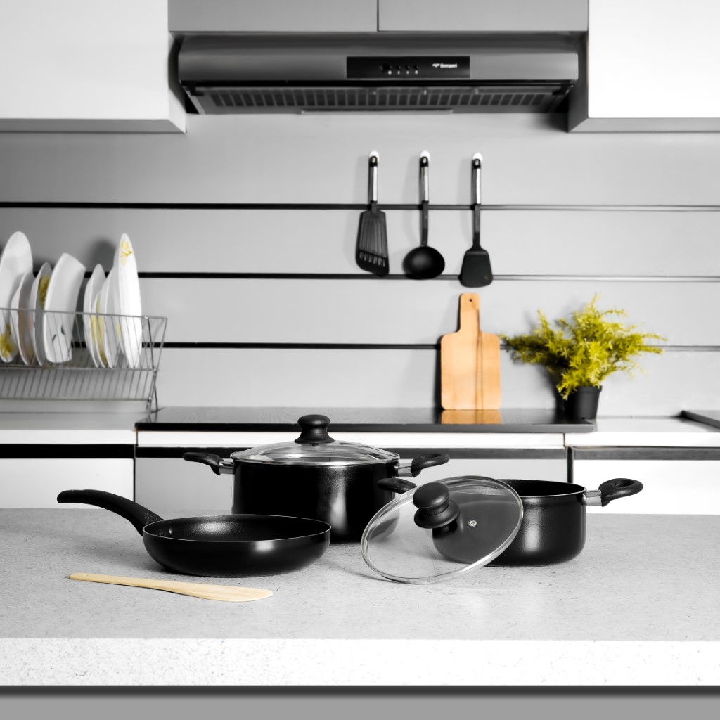 Make your kitchen look sleek and professional with this high-quality cookware set. From casseroles to pans and turners, the Royalford 6-piece non-stick cookware set with an aluminum body is the smart choice for a starter home. The 6-piece set includes a 24×11 cm casserole and lid, a 20×9 cm casserole and lid, a 24×5 cm fry pan, and a wooden spatula. With a stylish red heat-resistant exterior, an aluminum body, and a durable 3-layer nonstick interior, this cookware is appropriate for happy homes. The cookware set is PFOA-free, making it safe for everyday use. High thermal resistance and durability enable years of healthy and fast cooking. The flat CD bottom ensures even heat distribution and fast cooking. Featuring a stylish red color, modern design, and long-lasting durability, the set makes a thoughtful gift. Inspire the inner chef in you, get that apron on with this stylish beginner cookware set, and prepare healthy and delicious meals at home. The cookware set measures 58.5x14x30 cm in size. Bakelite handles and a tempered glass lid. This 6-piece cookware set has strong, soft, heat-resistant Bakelite handles that ensure safety, making it easy for beginners. Casseroles have transparent lids made of tempered glass with a steel frame. These lids allow easy monitoring of the contents and process and ensure moisture retention. Suitable for all cooking surfaces. The cookware set has a CD base and is compatible with other stoves such as gas, ceramic, halogen, and hot plate cooktops. ‘
