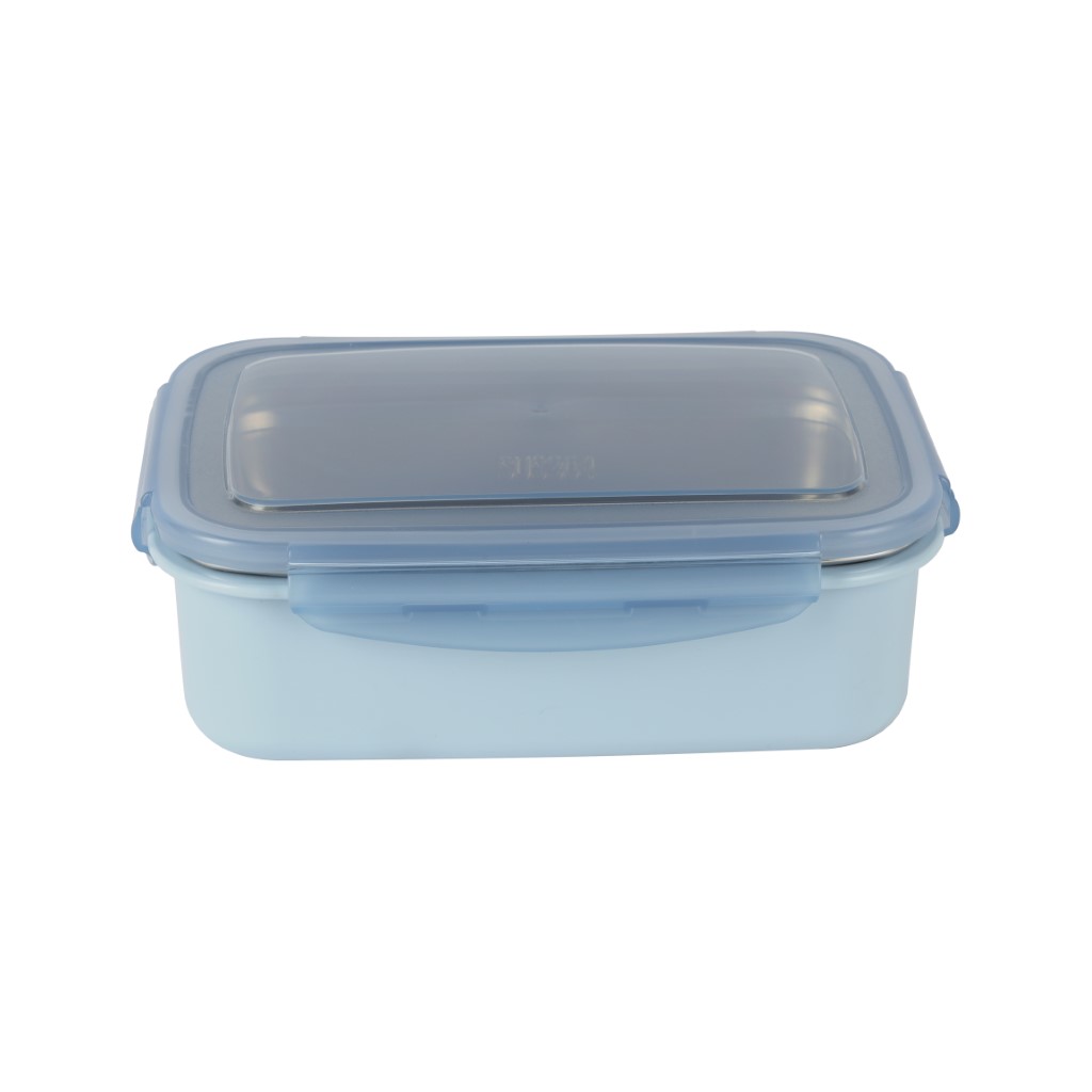 Royalford 850 ml Lunch Box- RF12187/ with Stainless Steel Inner, Spoon and Plastic Body, Rectangle Tiffin with Lid, 4 Side Locks/ Food-Grade, BPA-Free, Airtight and Leakproof Containers for Kids and Adults, to Keep Foods Fresh/ Compact and Portable Design/ Silver and Blue