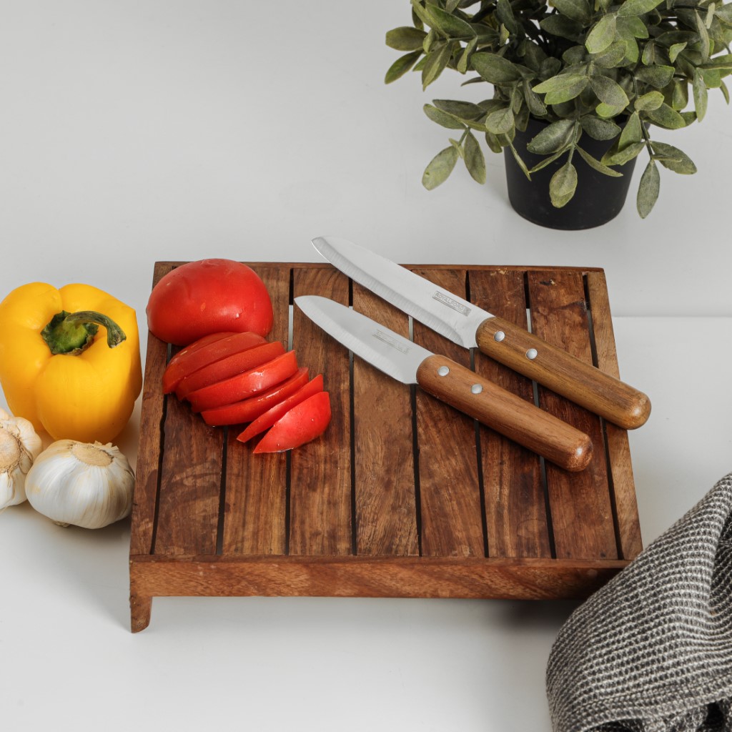 Whether you’re dicing, slicing, or chopping, properly sharpened knives provide you with clean, accurate cuts that speed up and simplify the meal prep process. Purchase the finest kitchen knife set from Royalford for your cooking area. This set of two essential knives is constructed from the highest grade stainless steel, has wooden handles, and is designed to function effectively. The ergonomically designed set features a comfortable handle made from wood that provides you with the right grip while making that perfect slice. The set includes a 5″ utility knife (23×2 cm) and a 3.5″ paring knife (19.5×2 cm). It has been especially designed for cutting, dicing, slicing, chopping, and mincing. The stainless steel blade of the knife is very sharp; you can easily cut vegetables, fruits, and much more without applying much effort and straining your hands. The top-grade stainless-steel blades help to make precise cuts that minimize food waste. The knives are highly durable, unbreakable, and strong enough to withstand pressure while cutting or slicing. The blade of the knife is very sharp; you can easily cut vegetables, fruits, meat, and much more without applying much effort and straining your hands. In addition, the ergonomic handles prevent hand fatigue during longer cutting sessions and also prevent finger numbness, user fatigue, or a slippery grip even when wet. This set offers safety and comfort at the same time while providing a hassle-free cooking experience. The set is perfect for both residential and commercial uses. The set is easy to clean and maintain. This is an effective cutting set in an appealing brown color and weighs 0.119 kg.