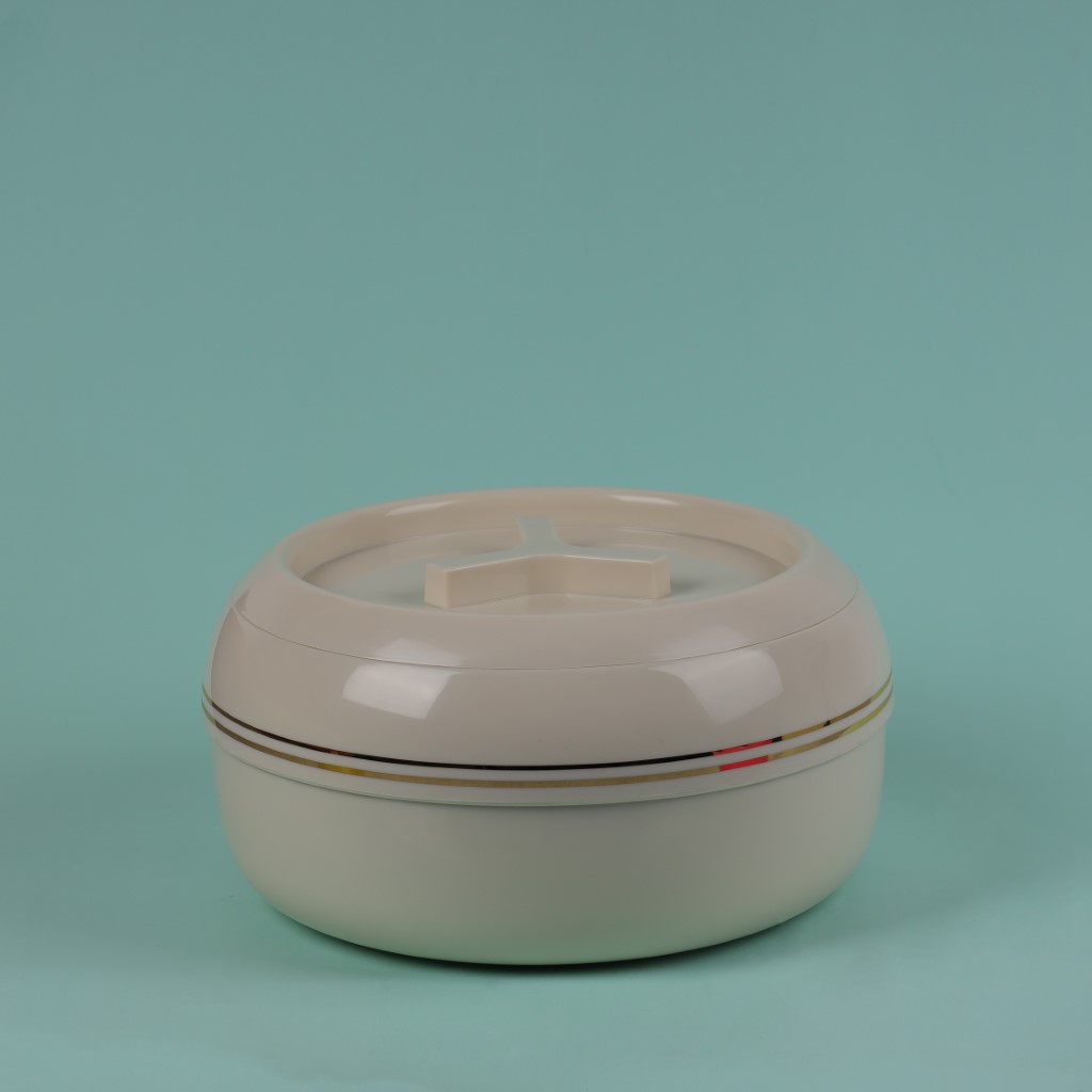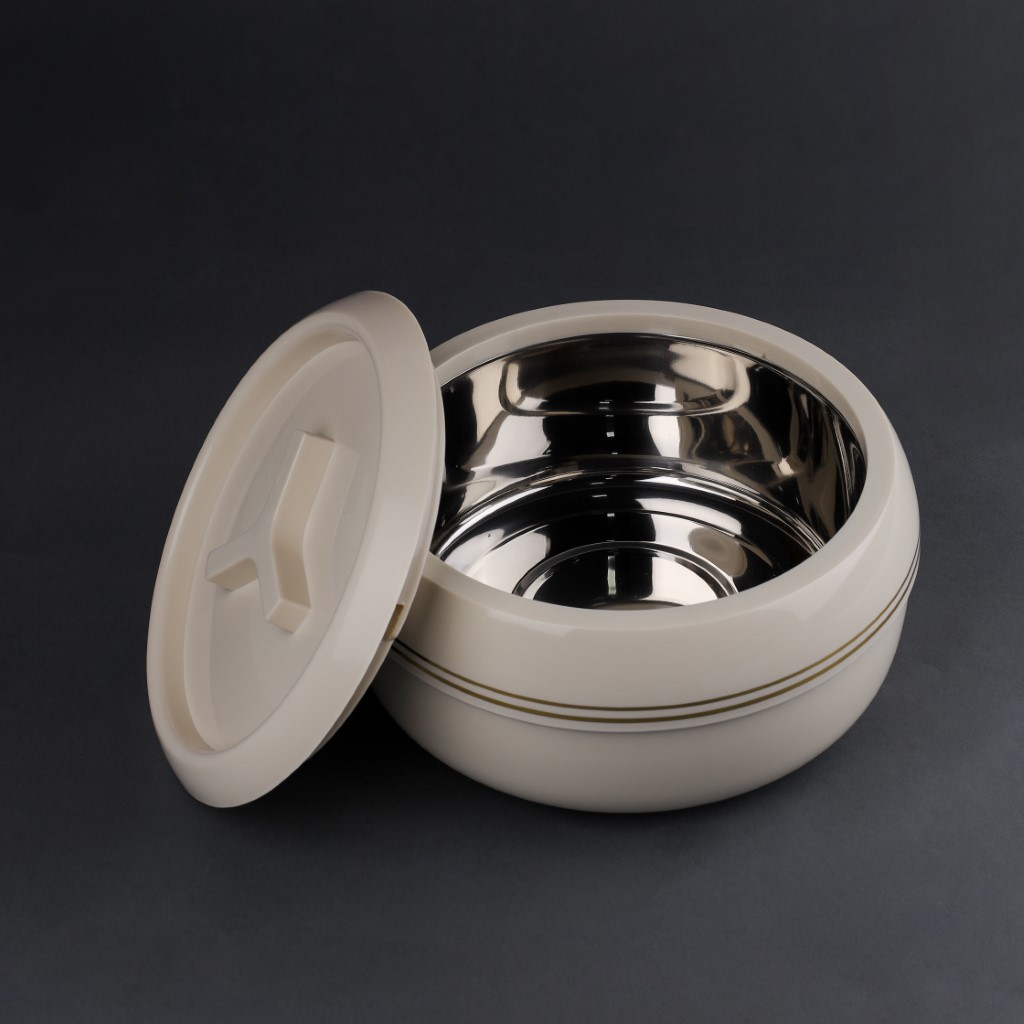 Your food will stay fresh for a long time with the Royalford Zoria insulated casserole. Constructed with superior-quality virgin polypropylene material, this casserole is BPA-free, lead-free, non-toxic, 100% food-grade, hygienic, and safe to use. Due to its non-magnetic PU-insulated stainless steel inner casting, the food can be kept hot or cold regardless of the climate for a long period. The firm twist-lock lid with comfortable handles allows a firm grip and helps you open or shut the casserole effortlessly. It allows you to preserve the flavors, aroma, heat, and moisture inside the hotpot. It has a large capacity of 3000ml, making it easy to hold a large quantity of food at a time. Its stunning and classic design will add to the look of your dining area and make the gathering more enjoyable and joyful. This ivory and golden-colored casserole is suitable for serving during get-togethers, family gatherings, parties, and potlucks, and will keep your soup, chapati, curry, snacks, etc. fresh for long hours. The casserole is designed to be handy. It is easy to clean and easy to store. There is an elegant range of colors and designs for the casserole, including ivory with a golden border and white with a silver border. The casserole is well suited for gifting, as it is both attractive and functional. It measures 26x26x14 cm in size and weighs 1.050 kg. ‘ “