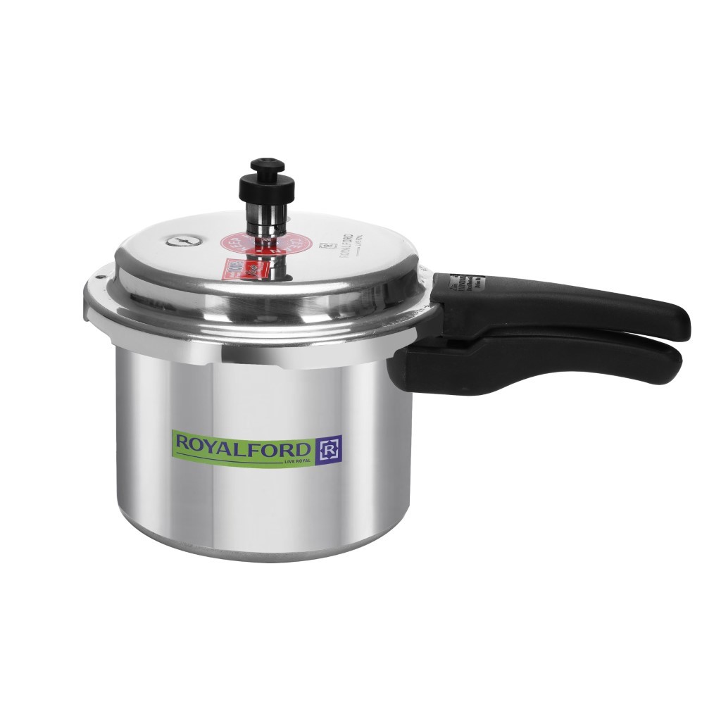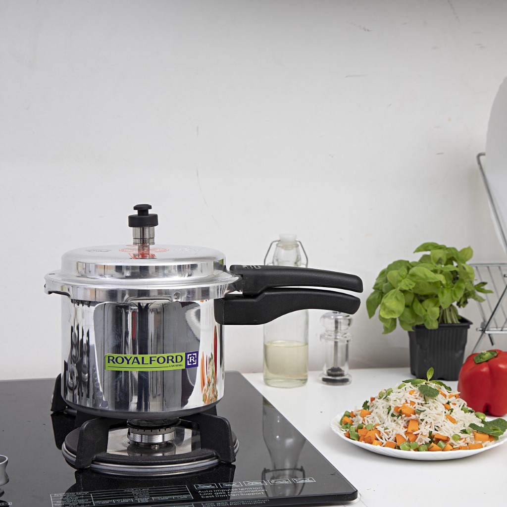 Royalford RF5801 3L Aluminium Induction Base Pressure Cooker – Lightweight & Durable Cooker with Lid, Cool Touch Handle and Safety Valves – Ideal for Gas and Solid Hotplates | 5 Years Warranty