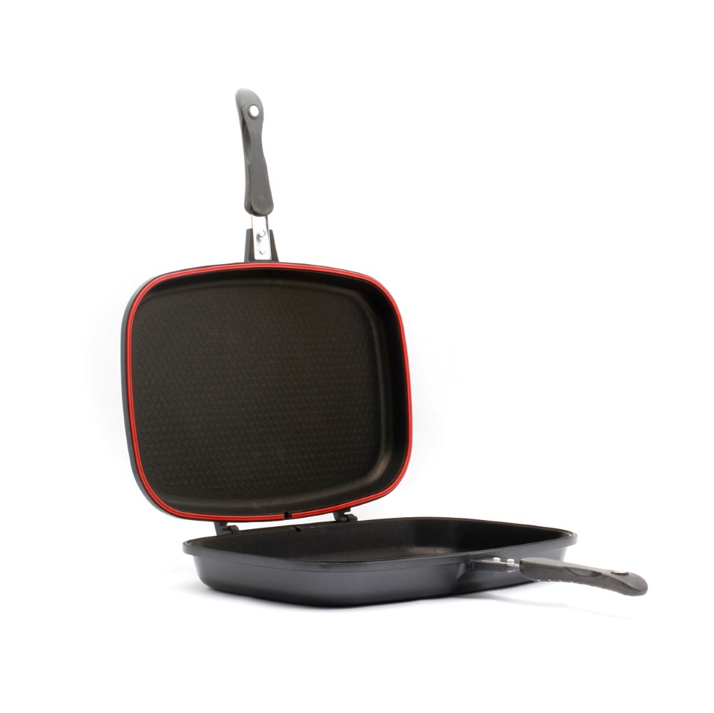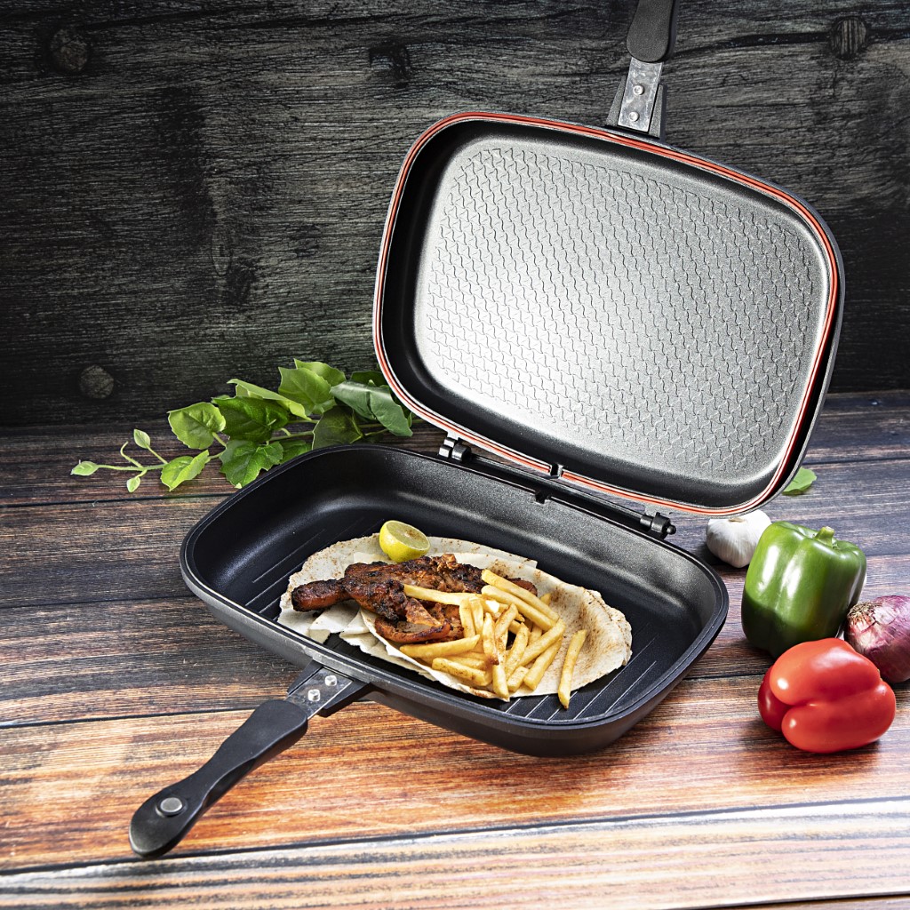 Royalford Die-Cast Double Sided Grill Frying Pan This pan provides superior cooking of almost all types of food. You can fry, grill, roast, bake and steam in it. Cook all types of meat, seafood and vegetables with less fuss, smell and mess. Cooking is healthier, as the non-stick surface requires less fat, while the design of the pan locks in more flavour and nutrients. Smells are reduced and you get less splattered oil. When one side is cooked, simply flip the pan over! The lid locks into place with an innovative magnetic handle-based design, and silicone piping inside the pan ensures a strong air seal to keep in moisture, flavour, steam, smoke and smell. Optimal Design -This griddle pan is specifically designed with the innovative double-sided grill and easy flip, this grill pan assures great tasting and perfectly cooked meals with minimal effort! No Mess – The double locking design keeps oil in the pan, which also prevents painful burns. With the special lock in mechanic, it becomes so much easier on the user to clean the grill pan after use. Non-Stick – Non-stick coated items are automatically much more optimal and ideal for kitchen use, which is why this double-sided pan is crafted in such a way. Coated in some of the finest commercial-grade non-stick materials, this grill pan is perfect for ensuring great tasting and well cooked meals that are easy to retrieve from the pan. This non-stick coating also makes for a much easier cleaning process afterwards. Cook Any Meal – The possibilities are endless with this double sided griddle pan. The distinct design is perfect to exquisitely cook any meal your heart desires.