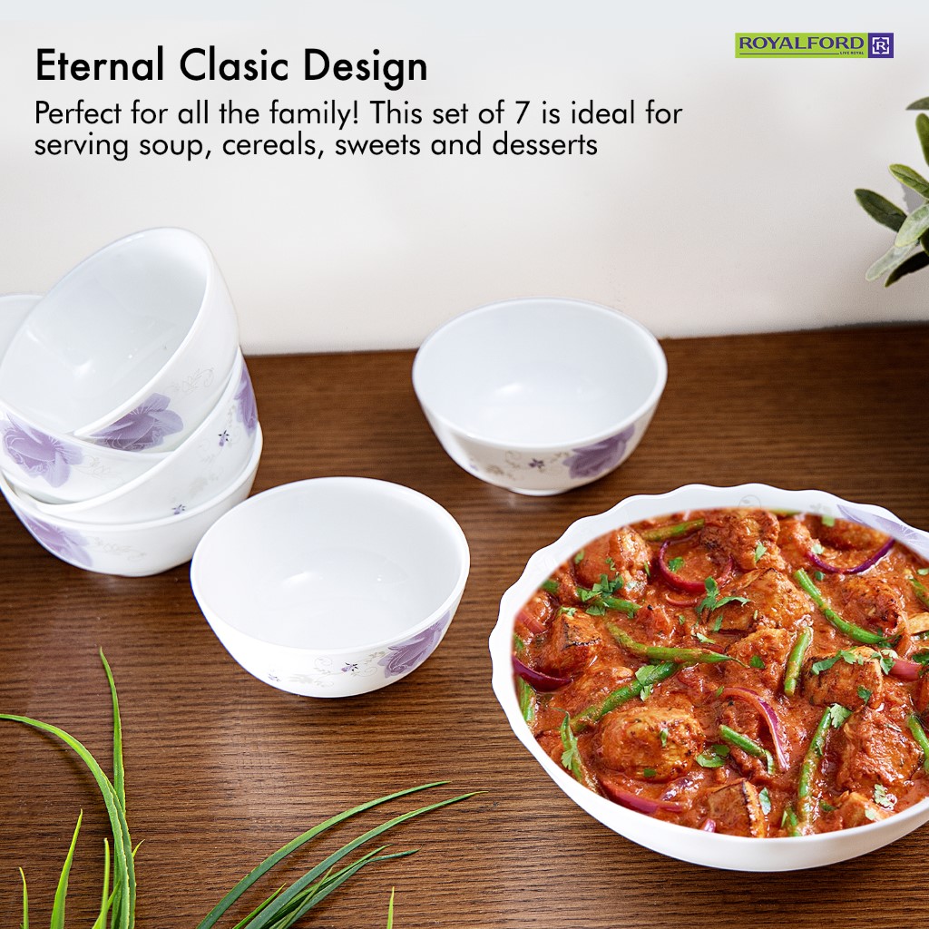 Royalford RF9858 7Pcs Premium Opalware Bowl Set, Lightweight | 1 Pcs 8 Inch Soup Bowl & 6 Pcs 4.5 Inch