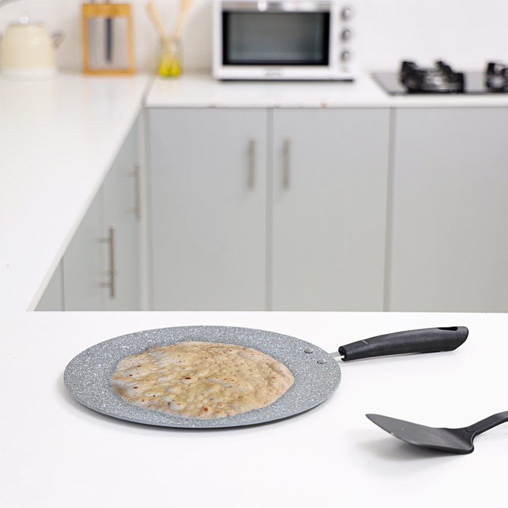 The Non-Stick Flat Tawa from Royalford with Marble Coating Pan is suitable for Pancake Crepe, Chapati, Roti Dosa. The most efficient cookware item for your kitchen is a marble-coated non-stick flat tawa. This tawa is needed in your kitchen to cook sweet crepes and tasty chapatis or even dosas. With a marble coating, you will never have to worry about unevenly cooked or burnt food. You will be able to make healthy foods with minimal effort. But have you ever considered its advantages?Marble-coated cookware is considered many times safer than normal cookware items. It has many natural properties, such as a non-stick surface and even heat distribution. This means that with this flat tawa, you’ll never have residue left and anything cooked will never be burnt or undercooked. You will be able to battle all your food worries with ease. The Royalford aluminium tawa is suitable for multiple types of cooktops such as gas, ceramic, halogen, hotplate, and modular cooktops. This ensures easy cooking for all types of kitchens! It is great for cooking all types of dough-based foods. A strong handle attachment will ensure that you can easily pick up or place the tawa and that there is no residue from food or water around the rivets. With even heat distribution surfaces and non-stick properties, you will also be saving energy. Food will be cooked to your requirements with minimal energy use. Therefore, even if you have last-minute guests or extra guests, you will be able to make something tasty in minutes. Make food healthier with this marble coated non-stick flat tawa. When using marble non-stick cookware, you will require less butter or oil to cook. 47X30X1.5 CM DIMENSION “