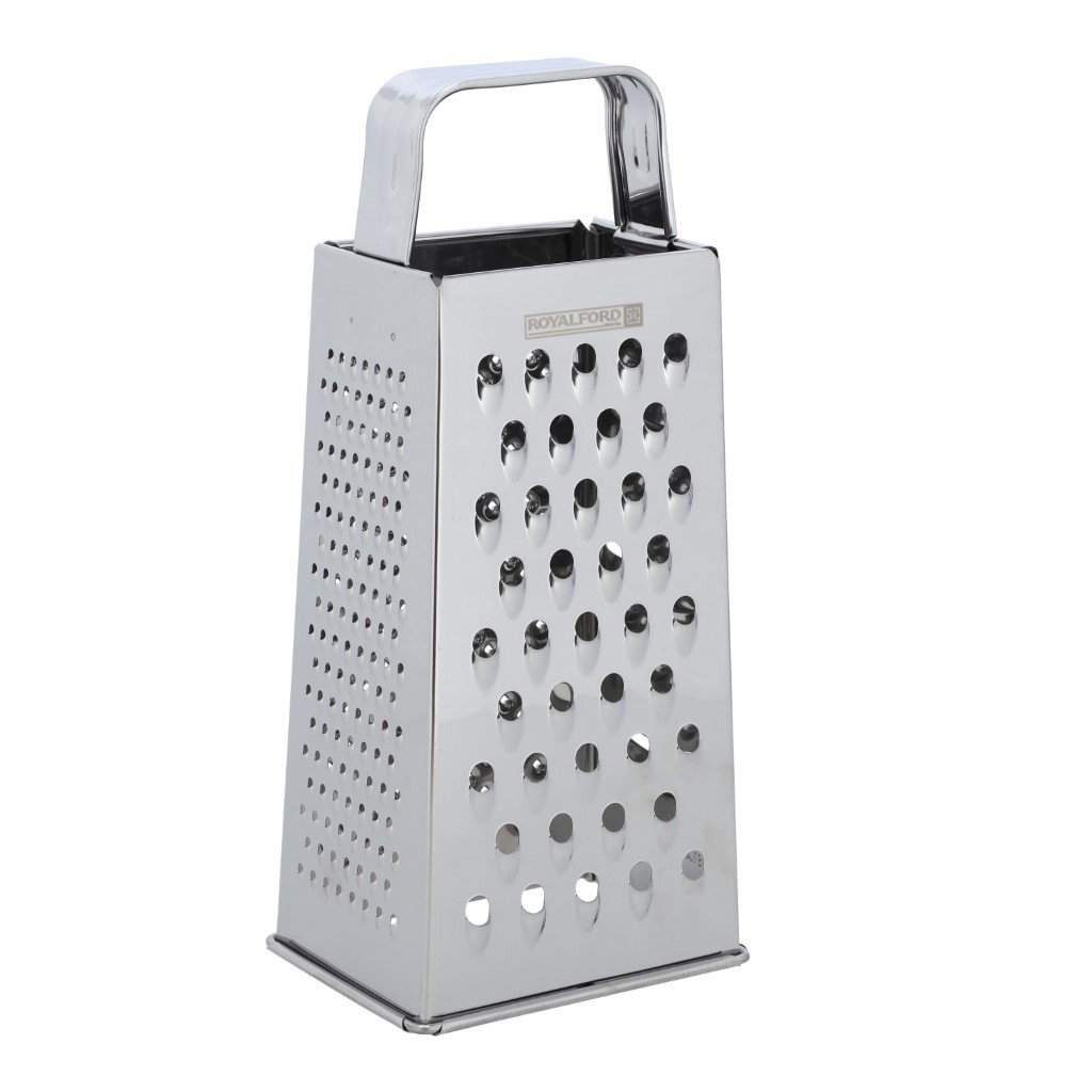 If your special recipe requires grating, zesting, and slicing, then owning a multipurpose tool that makes your food preparation easy is a must! The Royalford Stainless Steel 4-Side Grater is made of premium quality stainless steel that is durable, sturdy, and heavy-duty. Designed with sharp etched teeth that shred cheese, fruits, vegetables, and chocolate with little to no resistance at all. Consider getting rid of all the other graters and slicers you may own to make room for this. Coarse grating, Medium grating, Fine grating/Zester, and even a Slicer – all in one convenient tool. Quickly prep an array of foods like cheese, potato, squash, zucchini, carrots, lemons, and cucumbers. Multi-functional with a comfortable handle that gives you total control. Ergonomically designed with an extra tough rubber handle welded skillfully for a firm grip that can withstand pressure when grating hard ingredients. The bottom of the grater is anti-skid which is ideal for convenient and efficient grating as it will not slide around all over your counter. Stainless steel is naturally resistant to rust and corrosion so cleaning this tool is very easy also it is dishwasher safe so pop the grater in your dishwasher for deep and thorough cleaning. Size: 10.5x8x24.5cm; Weight: 165G ‘