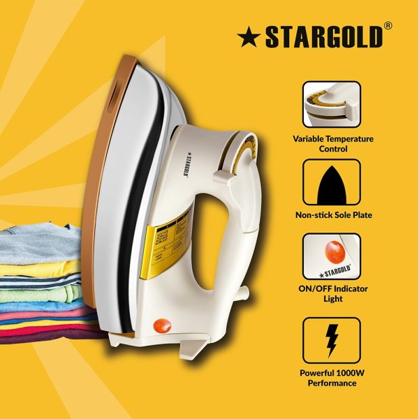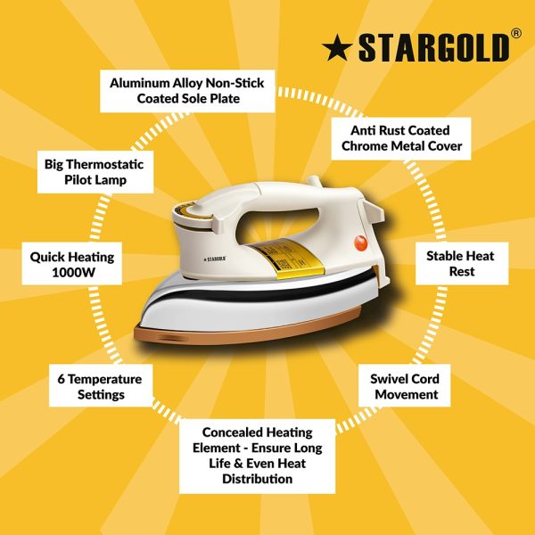 Stargold Automatic 1000W Heavy Weight Electric Dry Iron, Ceramic Coating, Automatic Thermostat Cut-Off, Suitable For All Clothes With 1 Years Warranty